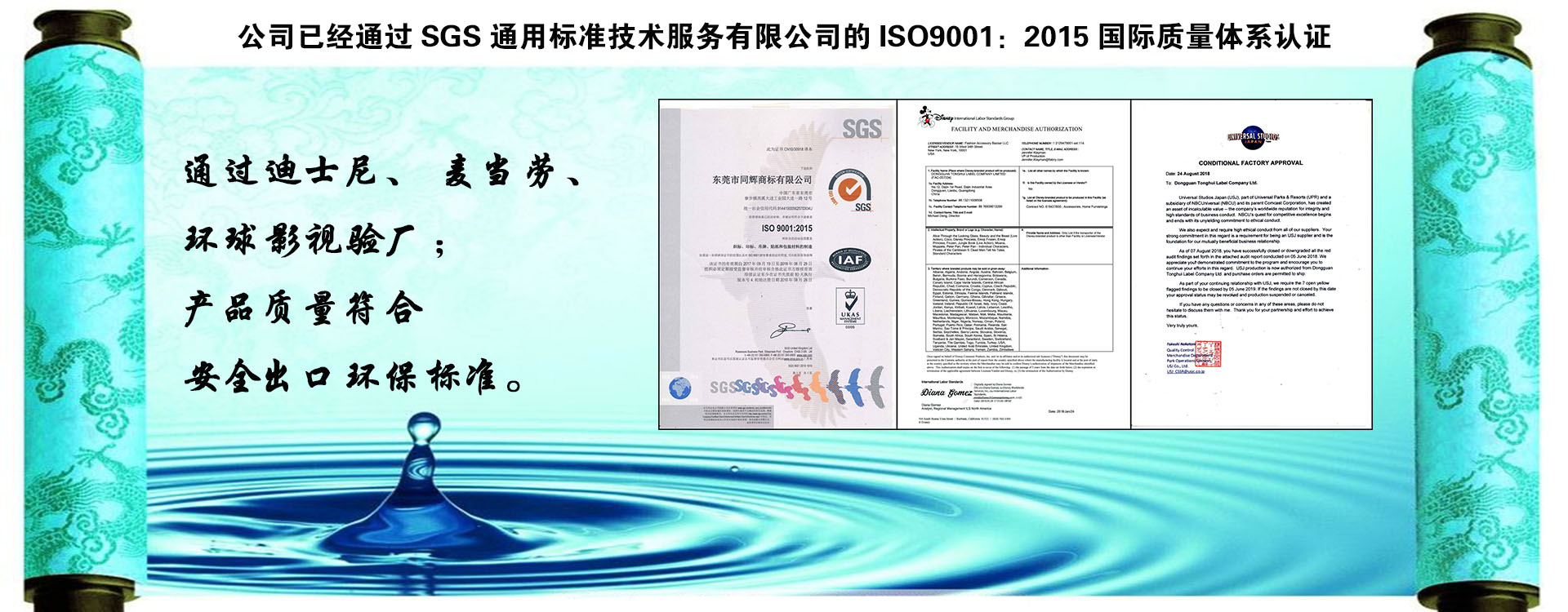 東莞市同輝商標輔料及包裝印刷有限公司是一家專業從事商標制造、包裝印刷的企業,主營生產和銷售:各類織嘜商標,織章,印刷商標,印嘜,標簽印刷,不干膠商標,絲印商標,熱轉印標,無感商標,燙嘜,皮牌商標,電壓商標、商標帶、繡花標,布貼標、皮貼標、商標吊牌,彩卡,折盒等廣泛用于各行各業。工廠經過多年的發展與開拓,規模日益發展壯大。從設計制作、工程研發、生產制造、產后加工、品檢、物流配送、售后服務等一套完整的優質服務體系,及優秀的經營管理團隊。已通過SGS ISO9001:2008(新版是2015版)國際質量體系認證,產品質量符合各國安全出口環保標準。承蒙國內外客戶的大力支持,目前已有許多國際著名品牌定點授權我公司生產,并是通過全球迪士尼FAMA認證驗廠,麥當勞驗廠,環球影視驗廠的供應商,是各行業值得信賴并具有實力的合作伙伴。
